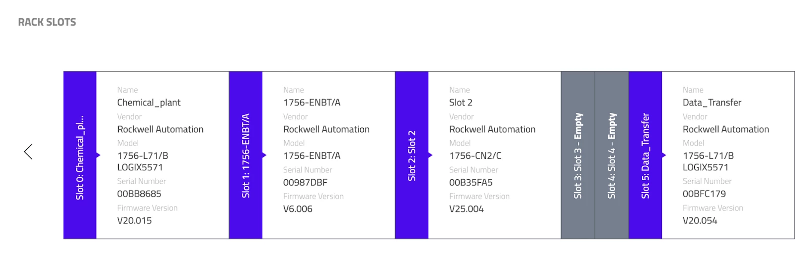 Claroty offers the choice of five different discovery options to profile assets, including the industry’s first “zero infrastructure” collection capability, Edge. And the profiling is some of the most detailed in the industry, enabling you to see the asset’s vendor, model, firmware, OS version, and protocol. See the image below for an example showing down to individual slot-level serial numbers and firmware versions of a PLC in a plant. This method of asset discovery offers precision, which is critical when discerning what exposures exist and the right mitigation for them.