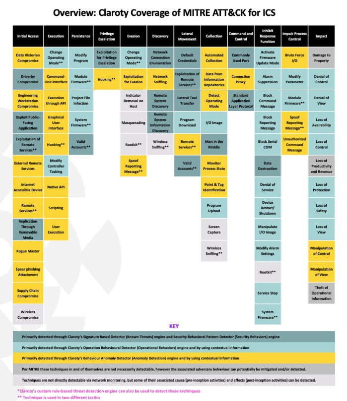 Here is an overview of how Claroty's five detection engines correlate to each adversary technique across all 12 tactics in the MITRE ATT&CK for ICS Framework: