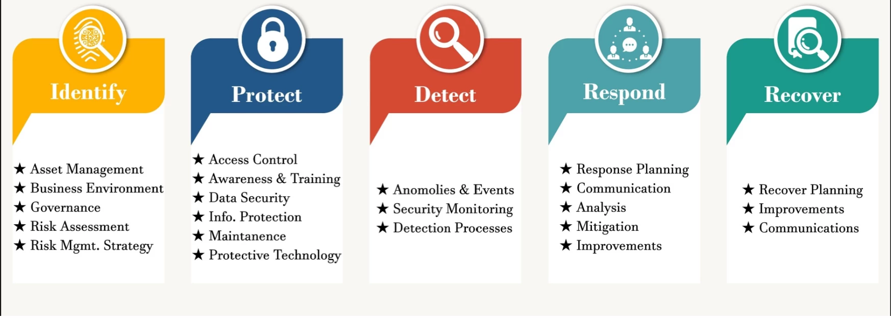 Recover: The final function includes the recovery activities which are implemented to ensure cyber resilience and business continuity in the event of a cyber incident. Recovery function categories include recovery planning, improvements, and lessons learned.