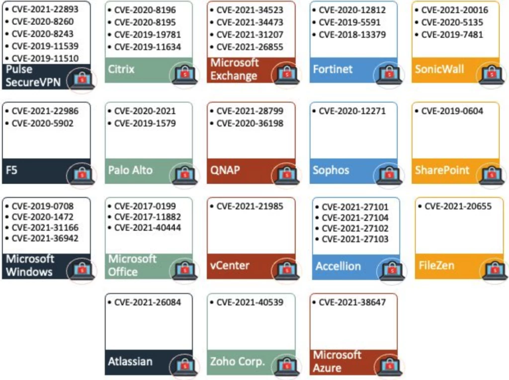 Within the industry, last week a crowdsourced list of vulnerabilities used to gain an initial foothold by ransomware operators and affiliates was made public, below. According to Allan Liska of Recorded Future who began this initiative, and a researcher known as Pancak3, this list will grow to include other vulnerabilities heavily targeted by ransomware groups for post-exploitation activity.