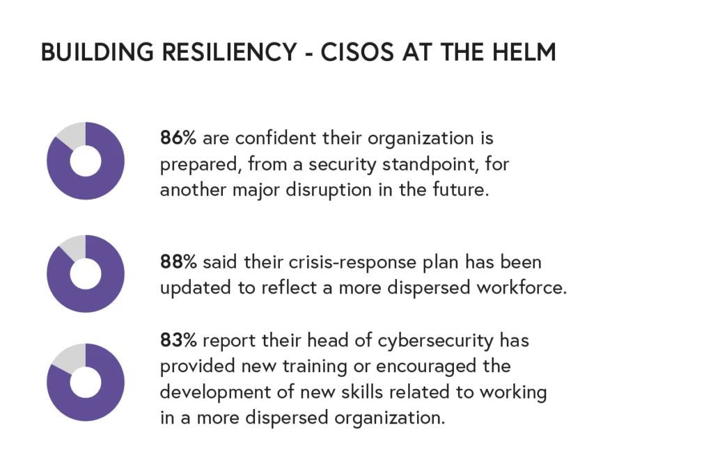 Nearly 90% of respondents said their organization has updated its cybersecurity crisis response plan to reflect a more dispersed workforce, and a similar percentage of respondents said leadership has sufficiently prioritized cybersecurity in responding to the pandemic.