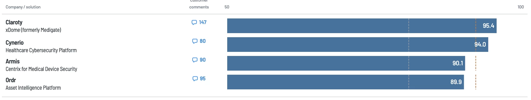 クラロティのxDome(旧Medigate)は、競争の激しいこの業界では珍しいことに、ヘルスケアIoTセキュリティ部門で5年連続でベスト・イン・KLAS受賞企業に選ばれています。『2025 Best in KLAS: Software & Services(ベスト・インKLAS 2025)』では、出版時点で42のユニークなヘルスケア組織からの顧客評価に基づいて決定されたxDomeのトップランキング維持について、さらに詳しく読むことができます。