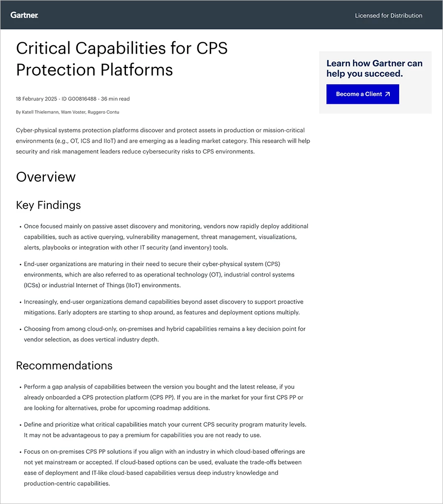 The inaugural 2025 Gartner® Critical Capabilities™ for CPS Protection Platforms report extends the Magic Quadrant™ analysis and provides a deep examination into the 17 providers evaluated. This companion report provides insight into this maturing space and technology category. In it, we feel that Gartner explains the necessary features for CPS Protection Platforms in order to secure a modern enterprise, including active querying, vulnerability management, threat management, playbooks, and essential integration advice.