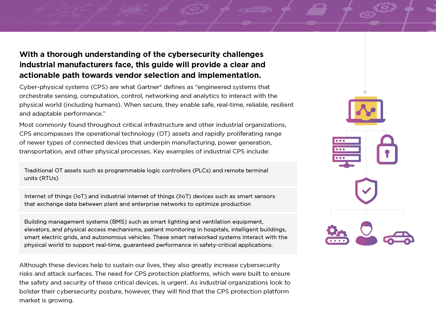 Cyber-physical systems (CPS) encompass OT assets and systems, along with a proliferation of connected devices. As these cyber-physical systems face new threats, and challenge traditional IT approaches, it is now more important than ever for organizations to incorporate CPS into their security strategy. However, it can be difficult to determine what criteria is most important to evaluate when partnering with a CPS security vendor. In this guide, we will break down the following topics to ensure you are choosing the right vendor to meet your unique needs: