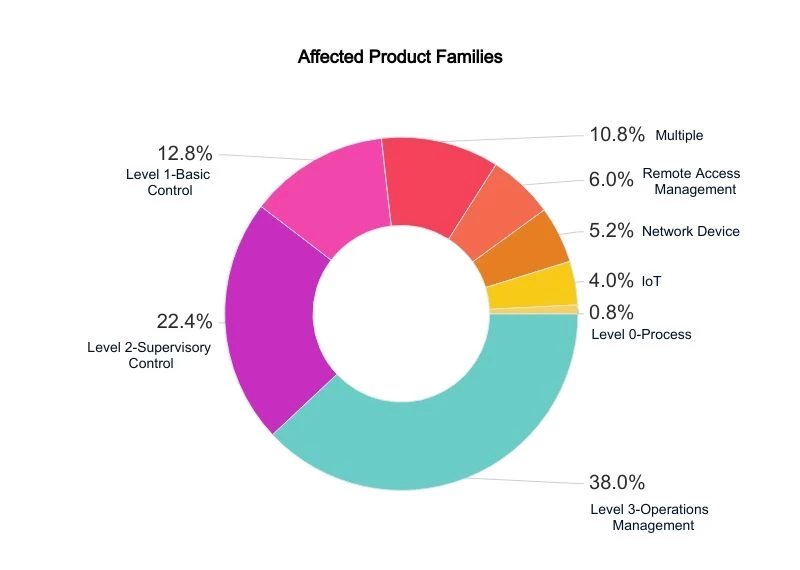In Team82's Biannual ICS Risk & Vulnerability Report for the 1H 2021, 26% of vulnerabilities across the ICS domain were not patched, or only a partial remediation such as mitigation advice was made available. Of the vulnerabilities with no fix or partial remediation, 62% were firmware vulnerabilities. More than half of those flaws enabled either remote code execution or denial of service conditions, both of which are likely to shut down or affect the integrity of industrial processes. The chart below shows where vulnerabilities found by Team82 affect product families, especially on Levels 1-3 of the Purdue Model.