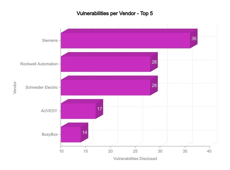 Team82 has focused on some of the leading automation vendors, working closely with them to improve the safety and reliability of their products. The chart below illustrates the number of vulnerabilities in Team82's dataset ranked by vendor; note that this should not indicate a lack of secure software or firmware development among these vendors. Instead, these numbers indicate a willingness to work with researchers, address vulnerabilities before they're exploited, and improve all-around security response efforts.