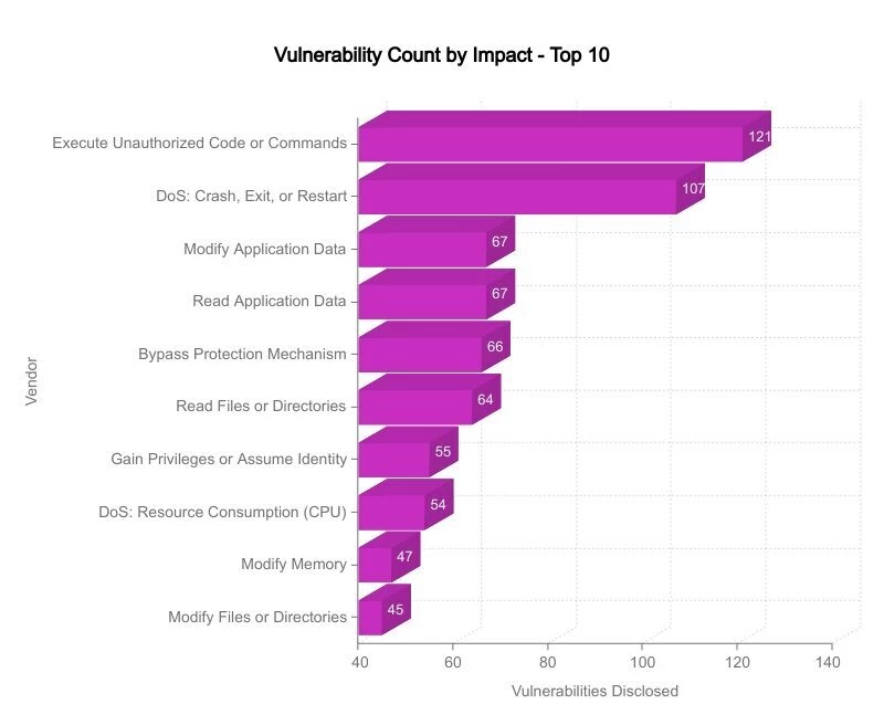 From Team82's dataset of 250 CVEs, we can see how dangerous the top five vulnerability classes can be to field devices. Not only do the most prevalent vulnerabilities Team82 uncovered lead to code execution or denial of service attacks, but application data may be modified or read in many cases. Below is a look at the top 10 vulnerabilities by impact: