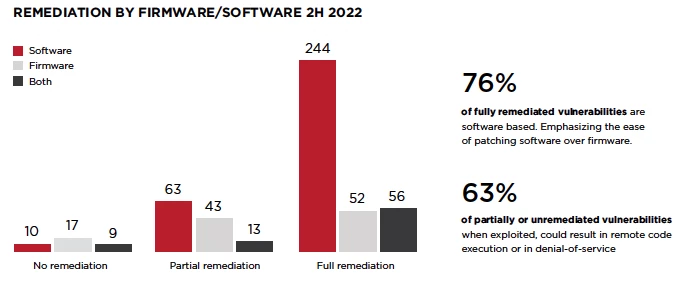 The good news is that the number of published OT vulnerabilities with partial or no remediation is dwarfed in the 2H 2022 by the availability of full remediations via software patches or firmware updates.