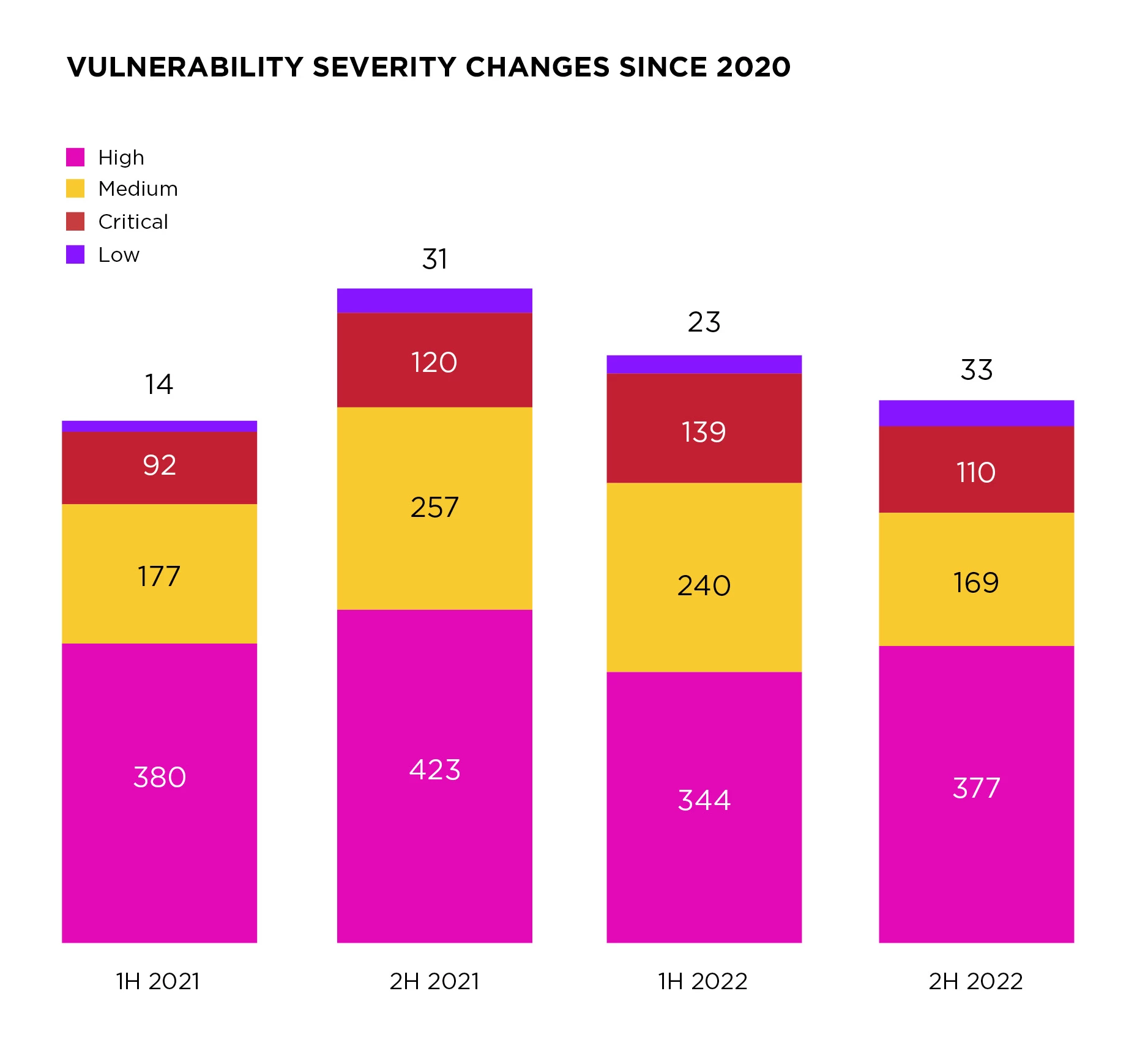 While the numbers of published vulnerabilities may be dipping, the same cannot be said for their criticality and potential impact. As demonstrated below, most of the published vulnerabilities in 2H 2022 are scored either high or critical. The 110 critical vulnerabilities from the 2H 2021 is the second highest total from Team82’s six reports.