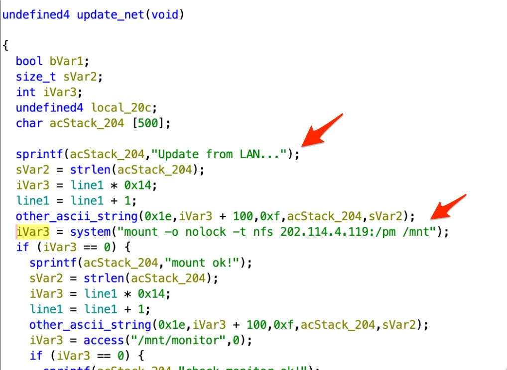 The update routine mounts the NFS share 202.114.4.119:/pm using the OS command mount -o nolock -t nfs 202.114.4.119:/pm /mnt