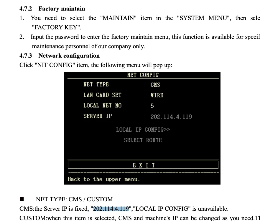 When examining this device manual and other white-label solution manuals, we see this IP address/subnet being used as the CMS IP address. (examples: 1, 2, 3, 4)