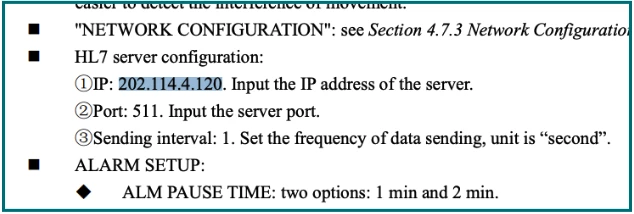 In addition to 202.114.4.119, another hardcoded IP address is used: 202.114.4.120 inside the firmware of the patient monitor. This IP address, also part of the routable subnet 202.114.4.0/24, is used by the patient monitor as a central HL7 server over TCP/511. The HL7 server allows the patient monitor to communicate and share the patient data it collects (heart rate, blood pressure, oxygen saturation, etc.) with other systems across the hospital. Once again we see that the vendor used a routable public IP address for this critical function handling sensitive patient information, which could lead to potential patient information leakage.