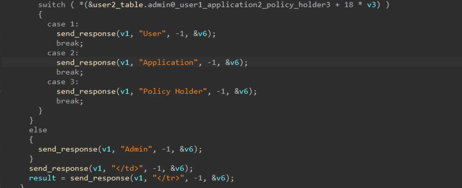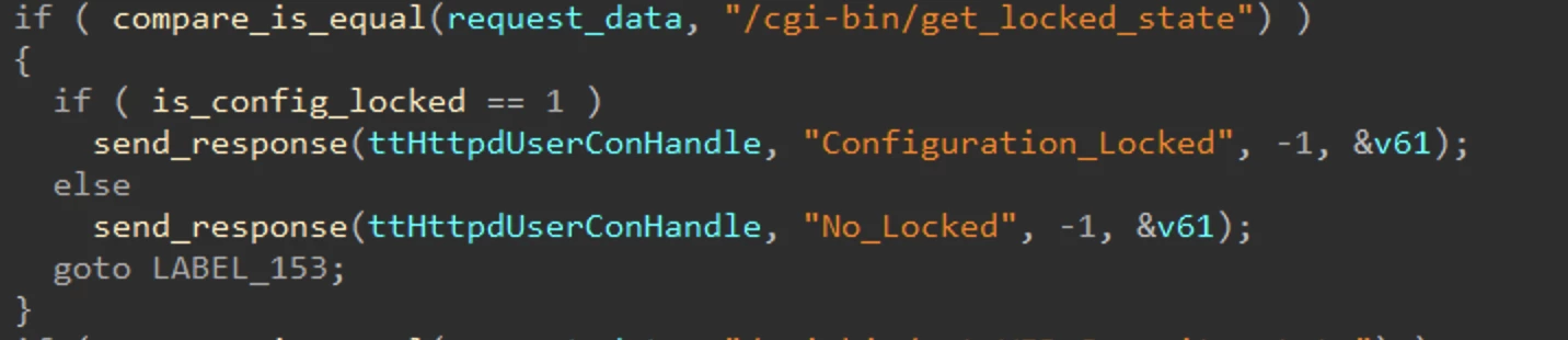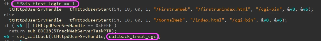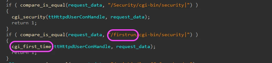 This means an unauthenticated attacker can bypass authentication by sending an HTTP request to the /firstrun/cgi-bin/security route. Since there’s no check enforcing that this function only runs during the initial setup, cgi_first_time will be executed, creating a PolicyHolder account (overwriting any existing configuration) with, specified in the request arguments, password.