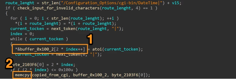 First buffer write (buffer_0x100_2): No size check is performed, meaning the device blindly writes user-supplied parameters into memory without verifying if they exceed the buffer’s boundaries.
