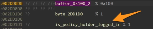 In the firmware version we analyzed, the global variable that determines whether the PolicyHolder is logged-in is stored immediately after buffer_0x100_2 in memory.
