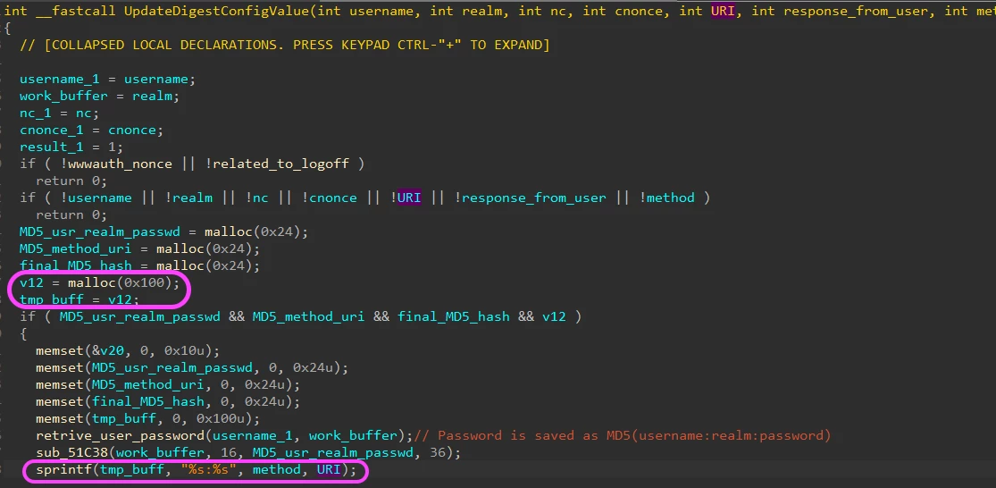 Now, let’s take a closer look. This string is assembled using the sprintf function without specifying a maximum buffer size (in contrast to snprintf). If the developer fails to ensure that the combined length of the method and URI stays within 254 bytes, the buffer will overflow.