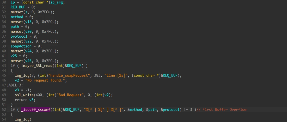 soap_serverd Stack-based Buffer Overflow Authentication Bypass VulnerabilityTo handle communication, soap_serverd reads the HTTP headers first and then proceeds to parse them using the sscanf function to extract the HTTP method, path, and protocol version.