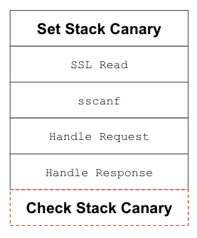 Stack canaries are set at the beginning of functions that have the potential for an overflow, but are checked only at the end of the frame. This means that by using the sscanf overflow, we can overwrite the canary, finish the request handling and response flow and only then get to the end of the function where the canary is checked.