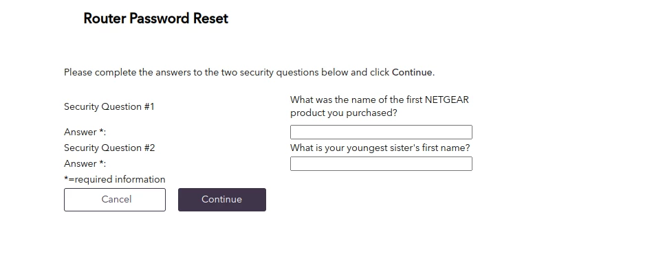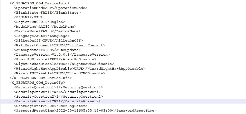 When setting up the router, users are required to enter a new, unique password and provide security questions and answers that will allow them to restore the password if they forget it. The answers to these questions are stored in plain-text (base64) in the device configuration. In order to reset the device password, users need the serial number of the router and the answers to the security questions. Therefore, by getting the raw configuration using the three vulns above, an attacker will be able to reset the admin password, below.