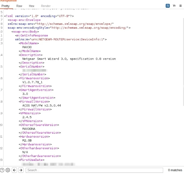 One of the few commands that does not require authentication is GetInfo. In the Get response, we can find details about the device such as the model, serial number, and more.