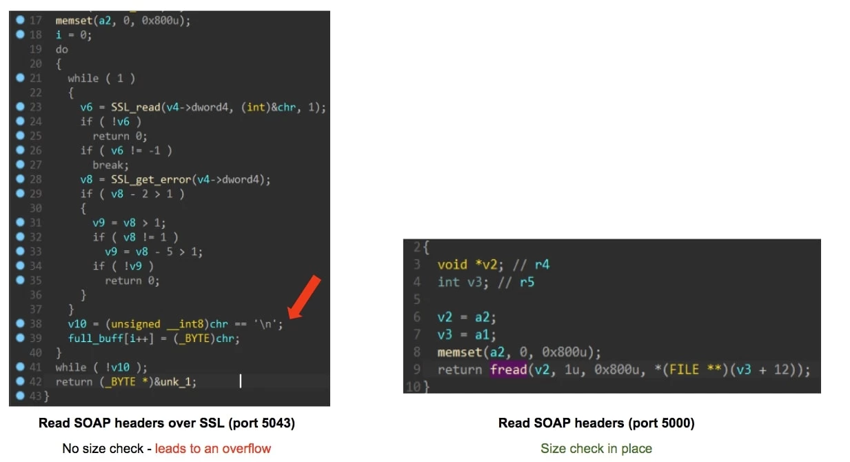 Different socket read and socket write functions are called depending on the port that the SOAP message was sent to. When reading the SOAP message headers, the server reads data from the socket one byte at a time. However, we discovered that in the SSL flow, the read function doesn’t check how many bytes were read, which could lead to a buffer overflow.