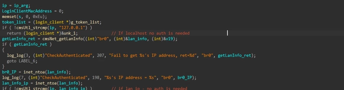 The first thing the server checks when authenticating users is whether the request came from 127.0.0.1 (localhost). Requests coming from localhost do not require authentication. Luckily we discovered that the socket source IP is stored on the stack in an offset we can overwrite with our stack overflow.