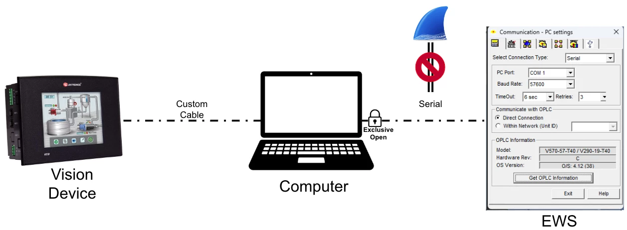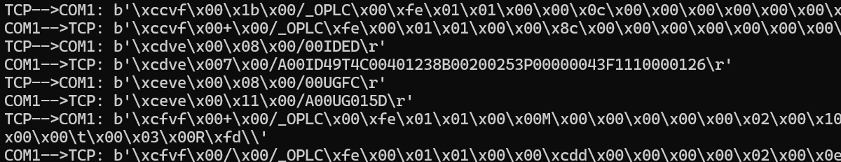 This gave us an idea: if we could not create a MiTM setup using a serial connection, maybe we could create a Python tool that would convert PCOM serial messages to PCOM/TCP packets. That way, our EWS would connect to our Python script using TCP/IP, instead of serial, and we would convert the packets to serial PCOM and send it to the PLC. Then, we could sniff and monitor the traffic using Wireshark (searching for the TCP/IP TCP stream), and modify certain packets in our Python script.