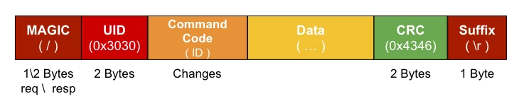 Unlike PCOM Binary, which in order to see if a message is a request or a response you had to check the command opcode (in this case - Command Code), in PCOM ASCII, a request and response have different magics. In case of a request, the magic / will be used, and if the message is a response the magic /a will be used.
