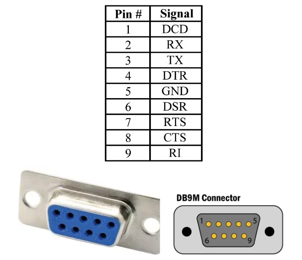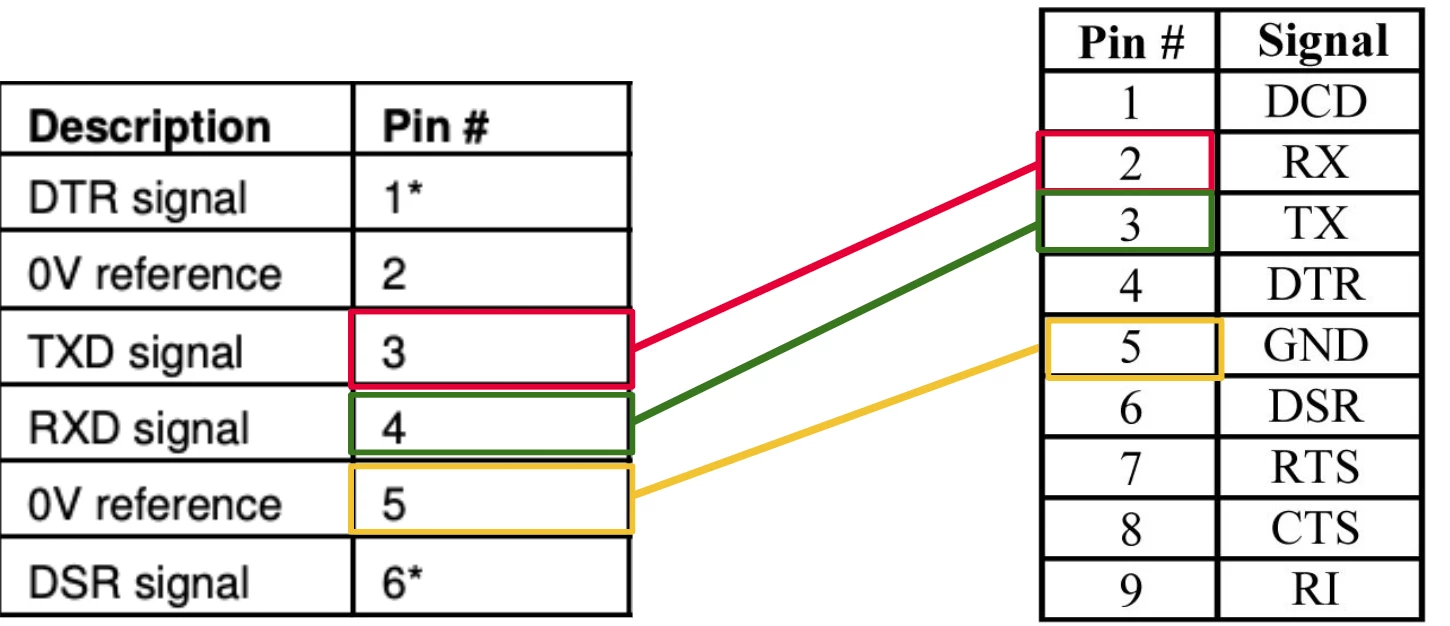 With this pinout in mind, our goal was to take an RJ11 cable and modify it to have a DB9 (male) connection on the other end, allowing us to connect to the PLC using the RJ11 side, and to our laptop using DB9 connection. Once again, we looked online for documentation on the DB9 pinout, which looks like this:
