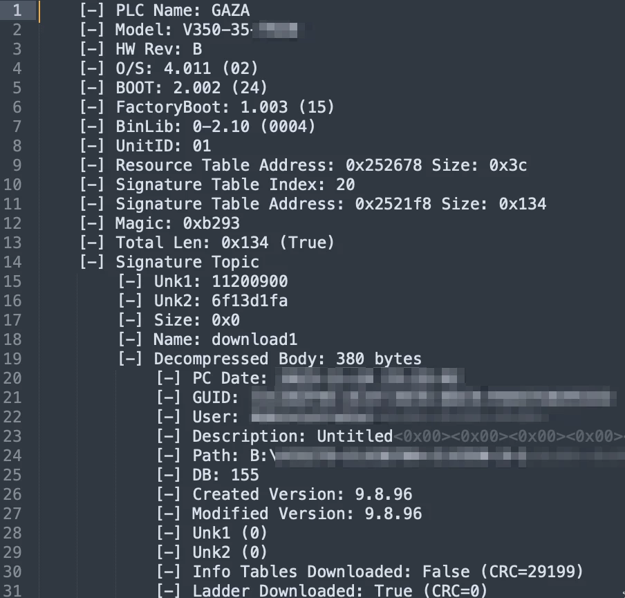 After reaching a dead end with the project file, we moved on to search for forensic evidence on the PLC memory itself. This was when we discovered an artifact stored on the PLC called Signature Log. This log contains a list of all the interactions that users performed with the PLC.