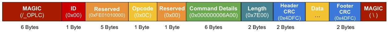 First, let’s look at a PCOM Binary request/response. In this protocol, each packet must start with a magic/hard-coded byte sequence which is the string /_OPLC , followed by an ID, a few reserved parameters, and the opcode itself. The full structure of the Binary PCOM message can be seen here: