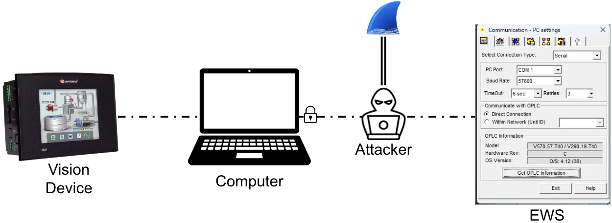 CyberAv3ngers leveraged the fact that the Unitronics Vision and Samba series of products had no PCOM password protection at the time. The attackers could connect to, and control the devices remotely using the Unitronics VisiLogic engineering workstation software to download a malicious project to the PLC, defacing it.