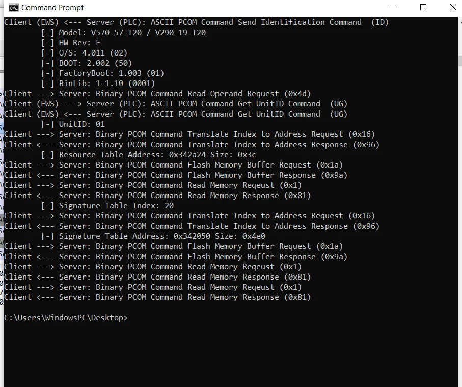 The first tool we developed, called PCOM2TCP, enables users to convert serial PCOM messages into TCP PCOM messages and vice versa. The second tool, called PCOMClient, enables users to connect to their Unitronics Vision/Samba series PLC, query it, and extract forensic information from the PLC.