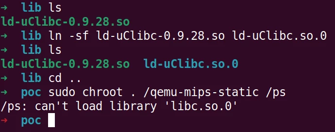 We need libc.so.0 also, in our case this is actually an alias to the libuClibc-0.9.28.so so we will bring it and try again.