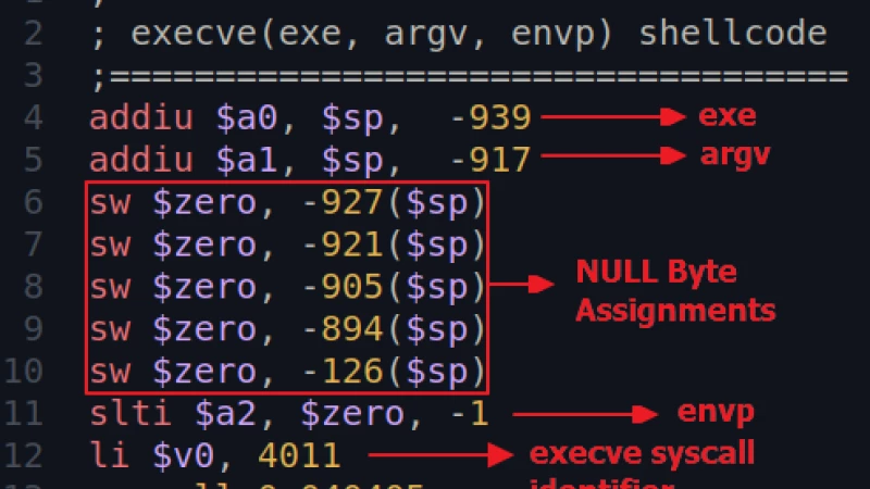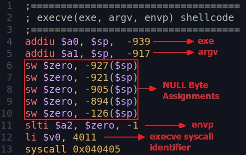 Our final shellcode invoked the execve syscall with controlled parameters also found in our payload on the stack and referenced using the $sp register as a base to offset from.