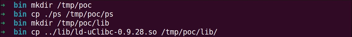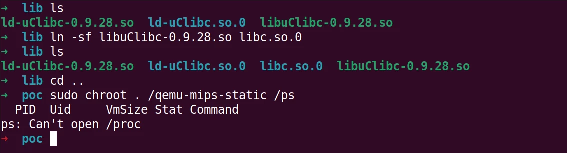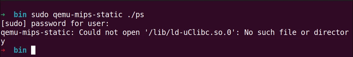 sudo apt install qemu qemu-user qemu-user-staticNow we can go to the directory containing our target executable and prepare our emulation environment. In our case we are going to emulate the binary ps. To emphasize the need for environment setup we are going to run this command using qemu and see what happens. By doing so we also demonstrate one of the potential hurdles one may stumble upon.