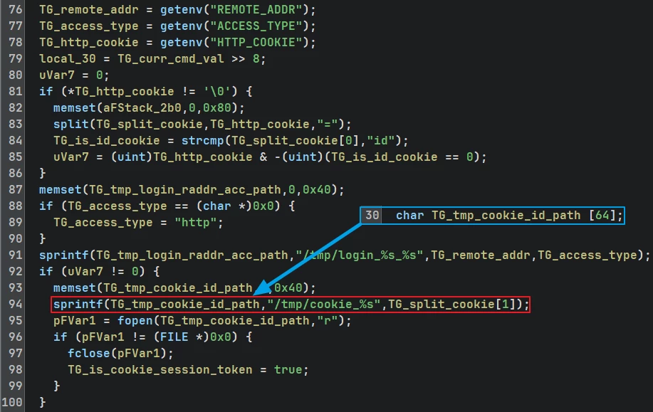 The cgi uses a specific cookie named id for client session management, the code checks if there exists a specific file (/tmp/cookie_%s) with the session id to determine if the request is in an active client session. The file existence check is done before verifying the credentials for authentication to determine if a client is already logged in with an active session. This means that the vulnerable code flow of the function is accessible in a pre authentication context and can be exploited by attackers without providing valid credentials.