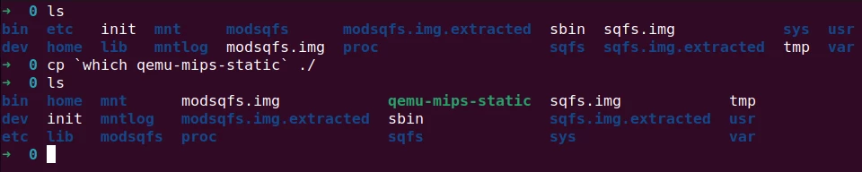The first thing we do is to go into the root directory of our extracted squashfs filesystem, which in our case is a ./squashfs-root/0 directory, and copy qemu-mips-static to this location.
