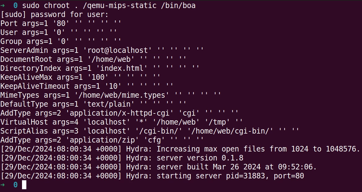 The next step in our research was to test the discovered vulnerability and create a working PoC to demonstrate exploitability and its impact. In order to develop our working PoC, we will use our knowledge of Qemu userspace program emulation, starting with emulating the whole boa web server and verifying we are able to interact with it.
