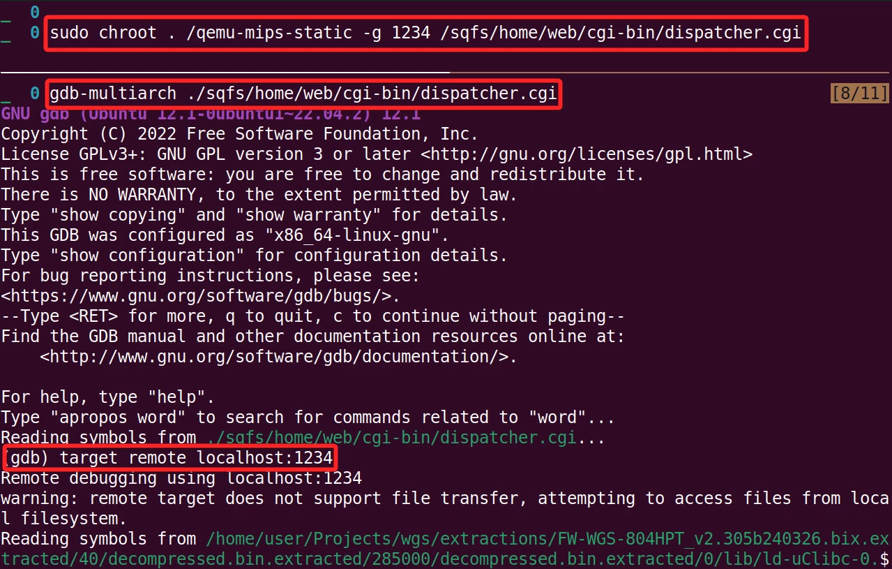Doing this will allow us to test the web service when we have a working exploit. But for our exploit development, we need to be able to debug the dispatcher.cgi CGI process. And so we will actually begin by just running the dispatcher.cgi program with a remote debugger attached to it. This is actually possible because qemu provides the option to initialize a gdb-server listener interface to debug an emulated application, below.