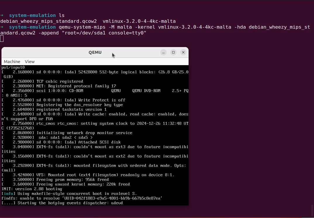qemu-system-mips -M malta -kernel vmlinux-3.2.0-4-4kc-malta -hda debian_wheezy_mips_standard.qcow2 -append "root=/dev/sda1 console=tty0"