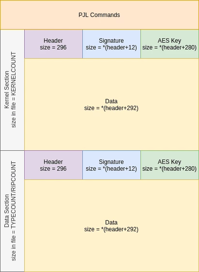 The function - pjlProgramRipCode - was pretty elaborate, containing references to HMAC, RSA and AES library functions. It seemed to parse the FLS file in several steps, parsing the kernel section according to KERNELCOUNT, and then the software section according to TYPECOUNT or RIPCOUNT (TYPECOUNT by default). The following is a summary of the flow in general terms: